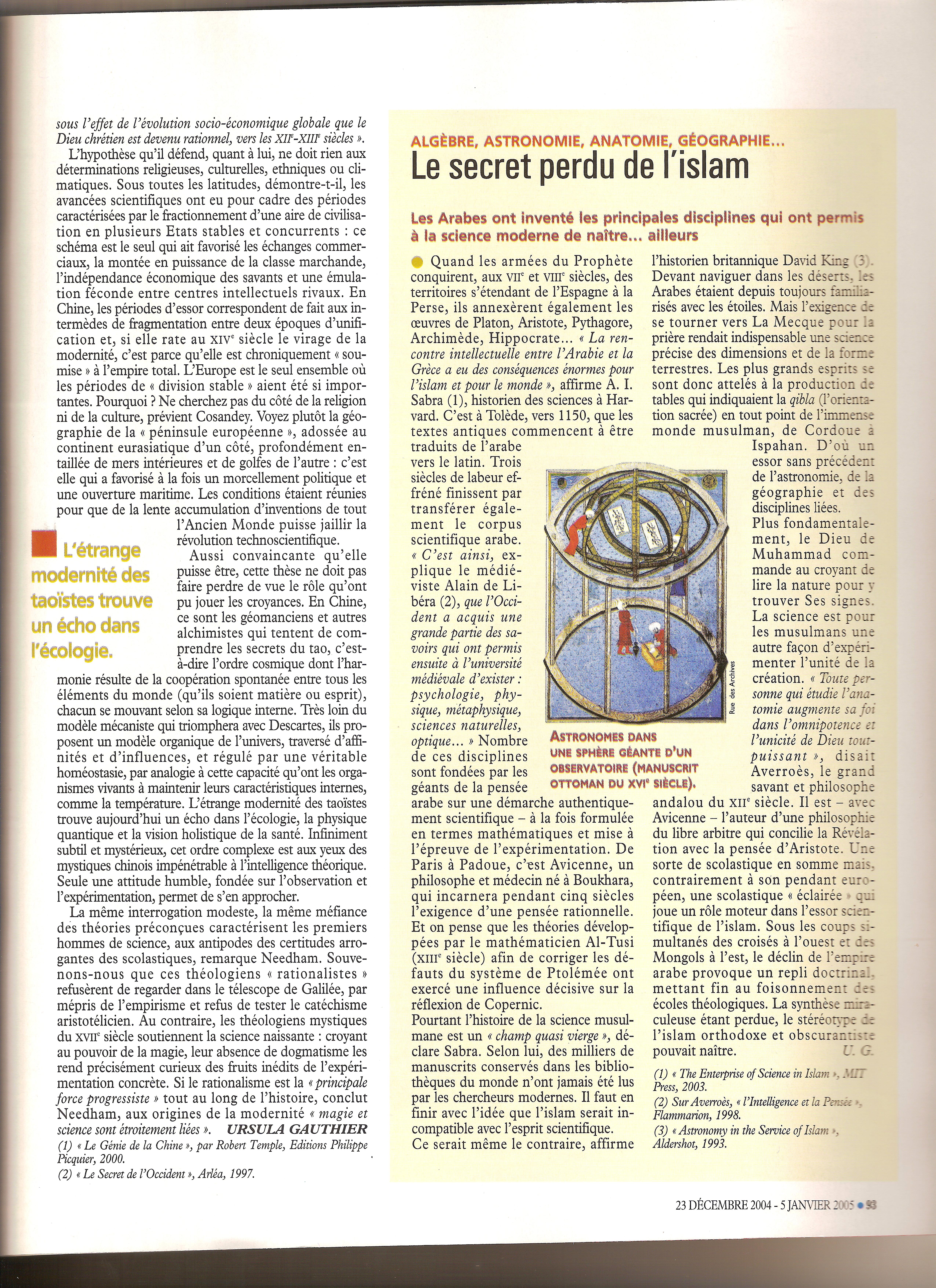 (Ursula Gauthier, "La Chine sans Dieu ni science", Le Nouvel Observateur, no2094-95, 23 déc. 2004, Article Chine. Article Islam. Couverture magazine. Copie de sûreté de la version internet: Le site Chine-Informations a également reproduit cet article. |