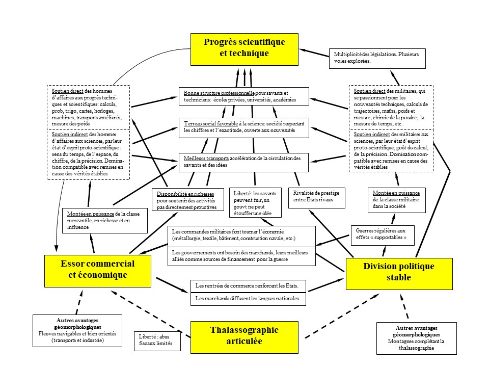 Résultats avancés inédits Une chose qui frappe dans ce graphique est la symétrie entre les rôles joués par les hommes d’affaires et par les militaires. Un soupçon s’insinue irrésistiblement : au fond, leur problématique pourrait être semblable : tous deux pourraient être l’émanation d’un phénomène unique. Une réflexion approfondie conduit effectivement à l’idée que guerre et commerce procèdent d’une dynamique commune. Dans les deux cas, on a affaire à un ensemble d’entités en lutte pour des ressources : ici des entreprises se disputant des marchés, plus précisément des clients ; là des armées se disputant des territoires, plus précisément des contribuables-corvéables. Marchands et militaires apparaissent comme des conquistadores de domaines différents, certes, mais pas foncièrement différents dans leur logique profonde. Ils sont en lutte les uns contre les autres pour ces ressources. En cas de monopole, respectivement d’État universel et de marché captif, tous deux s’endorment sur leurs lauriers et entrent en déclin. Dans le cas où il y a stabilité de la concurrence (maintien d’entités rivales sur une longue durée sans que celles-ci s’écrasent les unes les autres) et croissance (les entreprises prospèrent et croissent, les États s’agrandissent), des effets bénéfiques s’ensuivent pour le progrès des sciences et des techniques. On peut imaginer d’autres « dimensions » dans lesquelles ce phénomène pourrait jouer, hors l’économique et le politique : le religieux par exemple. Plusieurs religions en situation de compétition dans le même bassin de population, mais stables et durables, ne se montreraient-elles pas plus favorables à l’avance de la connaissance qu’une religion monopolistique ou une effervescence religieuse chaotique ? Quelques exemples, cités, mais pas encore thématisés, dans Le Secret de l’Occident, suggèrent une réponse positive : le christianisme naissant, qui, en butte à d’autres sectes à succès dans l’empire romain, a soutenu un progrès technique le livre [[ou codex, à savoir cet ensemble de pages reliées sur un côté, un objet qui nous est devenu familier, qui a alors succédé aux formats en rouleaux qui existaient auparavant]] comme moyen de s’imposer sur les autres ; les jaïnistes, en Inde, qui, confrontés à un foisonnement de sectes concurrentes et durables, ont encouragé les recherches en mathématiques pour briller aux yeux des fidèles potentiels ; ou encore les jésuites utilisant l’astronomie occidentale pour impressionner l’empereur de Chine. Mais une telle configuration (une même population divisée en plusieurs religions rivales et durables) demeure très rare au cours des siècles, aussi cette troisième dimension a-t-elle joué un rôle plutôt faible, voire pratiquement négligeable, historiquement. A ma connaissance, Carl von Clausewitz, dans son ouvrage célèbre De la Guerre (1832), fut le premier qui reconnut le parallélisme entre activité militaire et activité marchande, encore qu’il n’ait guère approfondi le sujet. On peut étendre la comparaison en y incluant la religion. Ces trois dimensions guerre, commerce et religion ne peuvent être considérées isolément ; elles interfèrent les unes avec les autres. Un innovateur soutenu par la classe marchande pourrait être anéanti par un empereur universel, un penseur soutenu par une secte rivale pourrait dépérir faute de financement pendant une phase économiquement déprimée, et ainsi de suite. La configuration idéale, logiquement, serait celle où les trois dimensions atteignent leur valeur optimale et se renforcent mutuellement [[en une sorte de résonance]]. Elle se rencontre dans un système d’États stable, connaissant l’essor économique, et adoptant chacun une croyance particulière pour se démarquer des autres. Cette configuration s’est retrouvée dans l’Europe classique et dans le monde arabo-musulman du Xe siècle. [[Époques caractérisées, on ne s'en étonnera pas, par des grands progrès des connaissances.]] Voici, au fond, ce que dit la théorie méreuporique : lorsque des entités [[càd des organisations]] (entreprises, États, religions) se disputent des ressources [[(ventes, taxes, dîmes), et donc les fournisseurs de ces ressources]] (clients, contribuables, ouailles) dans une dimension donnée (marché, territoire, esprit) et qu’elles arrivent à un équilibre dynamique, c'est-à-dire lorsqu'elles parviennent à durer et à croître tout en restant en forte compétition les unes contre les autres, alors est atteint un optimum favorable au progrès des sciences et des techniques ; trop de concurrence mène à des perturbations graves, à des destructions incontrôlables et finalement au chaos ; trop peu de concurrence conduit à l’immobilisme. Quand plusieurs entités [[organisations]] sont en présence et en compétition sans réussir à s’annihiler mutuellement, il s’ensuit une configuration où la concurrence peut pleinement déployer ses effets bénéfiques. Cette notion d’optimum a été élégamment explorée par Christophe Brun dans sa préface au Secret de l’Occident [[édition 2007]] [[Ce que la théorie méreuporique dit n’est au fond rien d’autre que ceci : lorsque des organisations (entreprises, États, religions) se disputent des ressources (clients, contribuables, ouailles) dans une dimension donnée (marché, territoire, esprit) et qu’elles arrivent à croître tout en maintenant une sorte d’équilibre dynamique entre elles, alors on atteint un optimum, favorable au progrès des sciences et des techniques. Cela se produit quand, au sein d'un ensemble d'organisations (États, entreprises, religions, etc.), au moins une partie d'entre elles parvient à durer et à croître, pendant des siècles, chacune dans sa dimension (en taxes, en chiffre d'affaires, en dîmes etc.), tout en restant en forte compétition les unes co