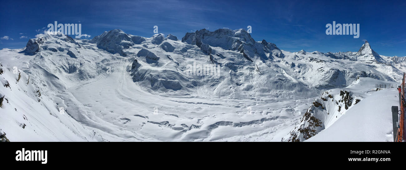 From left to right: Mont-Rose massif (9 peaks)[4'634m], Lyskamm massif [4'533m], the white twins Castor [4'223m] and Pollux [4'091m], the Breithorn massif (5 peaks) [4'164m] and (on the right side of the Breithorn, very small and close) the Small Cervin [3'882m]. Source: Wikipedia (0.18Mb). Autour du Mont Rose By Pierre Vittoz. Published in "Die Alpen/ Les Alpes", the journal of the Swiss Alpine Club (SAC/CAS), in 1946. Source. Safety copy 15 May 2023. 6 avril 1945. Nous nous empressons de tourner le dos aux brillants skieurs qui promènent leurs lunettes d'écaille et leur ceinture cloutée sur les trottoirs de Zermatt et longeons la crémaillère du [chemin de fer conduisant au] Gornergrat, chemin commode qui permet d'admirer le lent déploiement de la vallée; les bâtisses ne sont bientôt plus que des taches, tandis que sur un fond mauve d'après-midi finissant s'élèvent peu à peu les triangles familiers des Mischabel et du Weisshorn. A Rotenboden, la scène tourne; et c'est l'énorme chaîne qui s'étale du Théodule au Mont Rose [de droite à gauche: Cervin, col du Théodule, petit Cervin, Breithorn, jumeaux Pollux et Castor, Lyskamm, Mont-Rose].