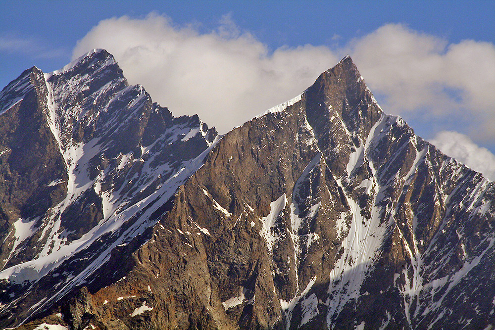 An article by Édmond Pidoux (39), Pierre Vittoz (22)'s mentor and friend, about their expedition to the Taeschhorn. They faced a double whammy: it had snowed massively the weeks before, and now the temperature had become very hot, making the thick snow cover unreliable. Albeit little known, the Taeschhorn is one of the highest peaks in Switzerland, with an elevation of 4'491 meter. It stands in the Zermatt area, close to the village Taesch (the last town that can be reached with car in the Zermatt valley before Zermatt proper), hence its name of "Mount Taesch". The Taeschhorn belongs to the Mischabel chain of 4,000m-peaks. This chain is oriented north-south, between Taesch and Saas-Fee. The following peaks form the main chain, linked by very steep crests like castle towers bound by fortified walls: the Dirruhorn (4'035 m), Hobärghorn (4'218 m), Nadelhorn (4'327 m), Lenzspitze (4'293 m), Dom (4'546 m), Taeschhorn (4'491 m) and Alphubel (4'206 m).