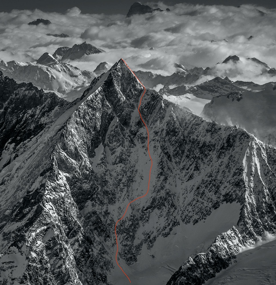 Le Taeschhorn (4'491m) et ses trois arêtes, vue aérienne. Au fond à gauche, l'arête du Dom. À gauche devant, l'arête du Diable. À droite, l'arête de Mischabel (Mischabelgrat). En rouge: la piste suivie par les premiers skieurs de l'extrême le 28 mai 2021... Source: Planet Mountain (0.72Mb). La dernière montée avant le sommet Voici pourtant la bosse ultime, et, au delà, l'édifice du sommet. Inutile de s'arrêter ici pour faire des plans d'attaque. Tout a l'air également mauvais: un couloir verglacé plongeant à gauche sur Weingarten, les côtes de ses rives, comme aussi l'échappatoire, par la droite, vers une nervure de la face de Fee. Allons voir de tout près. Quelques pas de descente, puis l'arête reprend [sa montée] — trente ou quarante mètres de corniche — jusqu'au pied du bastion. Déclenchement d'une avalanche Avant de m'engager dans le flanc, je bats du piolet la neige pour éprouver sa consistance. Alors, avec un déchirement soyeux, la corniche tout d'un coup se détache, bascule, roule en puissante avalanche sur le versant de Saas. Toute l'arête est ainsi dégarnie: comble d'efficacité pour un [seul] coup de piolet! D'abord impressionnés, nous profitons du chemin ouvert pour gagner le pied de la paroi. ... Nos craintes se confirment. Tout semble mauvais. Le mieux sera le plus simple: l'attaque en ligne directe. J'ouvre donc la trace dans la neige déjà molle et profonde. Le soleil la frappe de plein fouet: avant longtemps, la surface pourrait se mettre en mouvement; mais on sent dans la profondeur une couche bien adhérente. Sans elle, nous n'irions pas loin. La pente, en effet, se redresse. À pleins bras, à pleines jambes il faut lutter comme un nageur dans la pâte visqueuse. Impossible d'assurer mon compagnon dont je ramasse la corde sans pouvoir me retourner. Trois ou quatre longueurs, et nous touchons, non sans crainte, aux premiers rochers. Ils affleurent çà et là, disposés en plaques horizontales, qui se chevauchent et souvent surplombent. Partout, à droite et à gauche, des pendentifs de glace, des couloirs bleutés où la neige a glissé, des rochers casqués de blanc. ... La première paroi se révèle solide. Jamais encore je n'ai vu rocher pareil, si délité d'aspect et si bien soudé. S'il n'en était pas ainsi, nous ne pourrions surmonter ces bancs verticaux. Ils ont encore l'avantage de nous abriter contre la chute éventuelle des glaçons et des pierres. La grimpée se poursuit, à la faveur de ces auvents, tantôt en les tournant, tantôt en nous servant d'eux comme d'escaliers. Mais quelle tension encore! Pas un endroit de repos, pas un point d'amarrage. A mi-hauteur, enfin, un bec d'enclume fait saillie. Pour la première fois j'assure Vittoz, et quand il me rejoint sur le bloc, nous nous accordons quelques minutes de repos, deuxième halte depuis notre départ. Mais s'agit-il vraiment d'un repos, quand on ne peut détourner l'attention de ce qui vous attend, ou de l'échelle de pas suspendue à ses pieds? Arrivée au sommet du Taeschhorn, le 25 août 1948 ... La suite ne fut ni pire ni meilleure; mais quand je touchai les débris de poteaux qui marquaient les derniers rochers, je n'en demandais pas davantage. Avec une sorte de rage, attaquant un ultime mur de neige, d'un violent rétablissement, je m'élançai à califourchon sur le sommet. ... Nous n'y restâmes pas trente secondes, notre premier regard ayant été pour le chemin de descente. Vittoz, sur la foi d'un récit, me l'avait promis facile, agréable, certainement pisté. Nous ne vîmes qu'une paroi de neige d'une extrême raideur et deux arêtes, à droite et à gauche [l'arête du Dom et l'arête du Diable], plus vilainement cornichées que tout ce que nous avions vu ce jour-là. Pas une trace, aussi loin que portât le regard. J'avoue que la surprise fut douloureuse. Nous avions notre compte de ce genre de beautés. Mais à quoi bon épiloguer? Seule l'action immédiate pouvait refouler notre dépit. Redescente depuis le sommet du Taeschhorn par l'Arête du Diable Nous voilà donc engagés sur l'Arête du Diable [conduisant du Taeschhorn vers le sud-ouest, au Kinhorn (3'750m) et au glacier de Kien], qu'il faut suivre jusqu'à la selle précédant son premier ressaut. De là, par la paroi nord, il nous sera possible de gagner les séracs du glacier de Kien, pendus en grappe au flanc de la montagne. L'arête est ici constituée par des dalles en porte à faux vers le sud. La neige recouvre les minces doigts de pierre; elle les prolonge au-dessus de l'abîme, étend de l'un à l'autre des membranes de palmipèdes. J'essaie de descendre assez bas pour tourner l'obstacle, mais la couverture de neige est trop légère. Nous envisageons alors de descendre la paroi nord directement; mais, incapables d'évaluer sa hauteur comme de discerner sa rimaye, nous craignons de nous engager dans une entreprise épuisante. Force est donc de revenir aux dentelles et de les dégager patiemment au piolet. La neige est heureusement maniable, et je travaille du manche autant que du fer, abattant les collerettes, crevant les membranes, massacrant pied à pied, mètre à mètre, cette hivernale floraison. A mesure que le rocher se découvre, il faut gravir les plaques et les descendre, enjamber les couloirs, sculpter les prises. Je travaille avec fureur. Lentement, lentement, nous descendons ainsi à la rencontre de la selle. Réunis sur son replat, nous nous retrouvons pour la première fois depuis deux heures en toute sécurité. Vittoz se met en position d'assurer ma descente dans la paroi, filant nos cinquante mètres de corde. La neige, de nouveau dure, ne pourrait être meilleure. À reculons, je descends comme à l'échelle, crevant à grands coups de pied un seul par degré la pente unie. Bien tenu, je puis me permettre une allure très rapide qui me soulage délicieusement. Vittoz me rejoint avec assurance. Quelle gratitude on éprouve, dans un endroit pareil, à l'égard d'un 